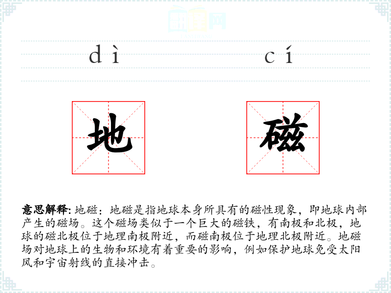 “地磁”一词由“地”和“磁”组成,其中“地”指地球,“磁”指磁性。这个词在中文中的使用历史相对较短,主要是在现代科学发展后才开始广泛使用。