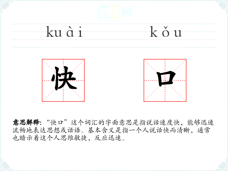 “快口”这个词汇的字面意思是指说话速度快,能够迅速流畅地表达思想或话语。基本含义是指一个人说话快而清晰,通常也暗示着这个人思维敏捷,反应迅速。