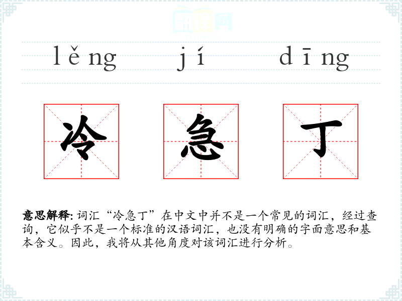 词汇“冷急丁”在中文中并不是一个常见的词汇,经过查询,它似乎不是一个标准的汉语词汇,也没有明确的字面意思和基本含义。因此,我将从其他角度对该词汇进行分析。