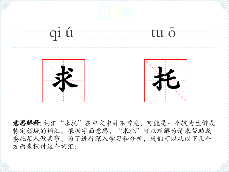 “求托”的字面意思是指请求他人帮助或委托他人完成某项任务。这个词汇可能出现在需要他人协助或支持的场合。