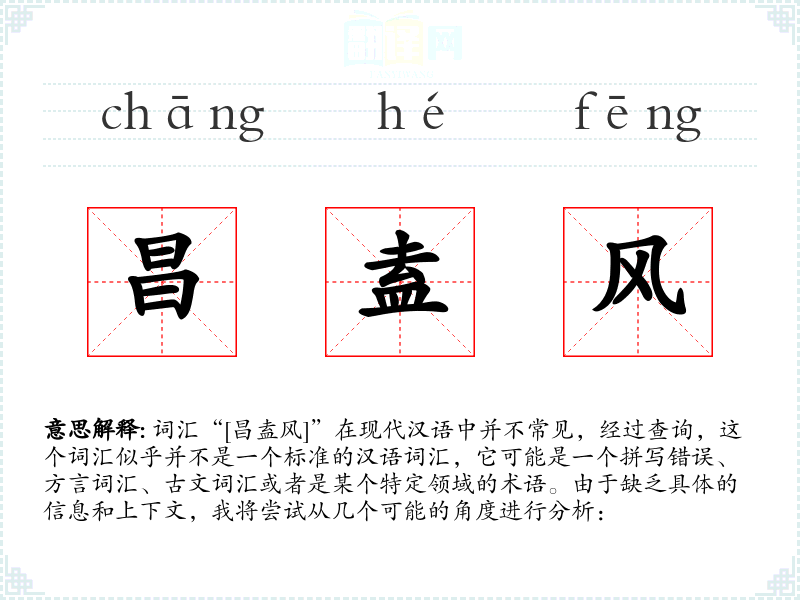 总的来说,对于一个不明确的词汇,我们需要更多的信息和上下文来提供准确的分析。如果“[昌盍风]”是一个拼写错误或者误解,建议提供正确的词汇或者更多的上下文信息以便进行准确的分析。