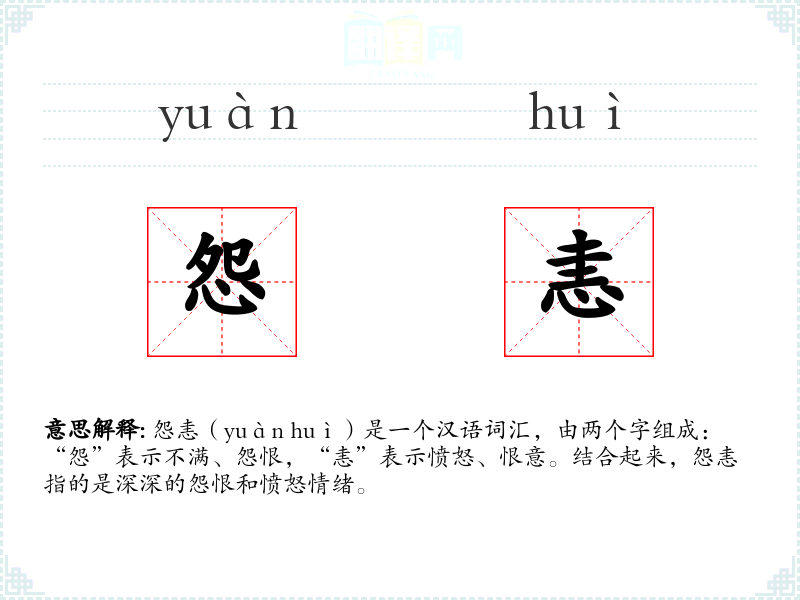 怨恚(yuàn huì)是一个汉语词汇,由两个字组成:“怨”表示不满、怨恨,“恚”表示愤怒、恨意。结合起来,怨恚指的是深深的怨恨和愤怒情绪。