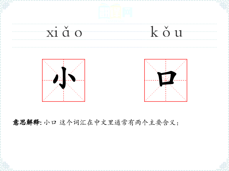 “小口”这个词汇的词源较为直接,由“小”和“口”两个字组成,没有复杂的演变历史。在中文中,“小”通常表示尺寸或程度上的小,而“口”则指嘴或开口。