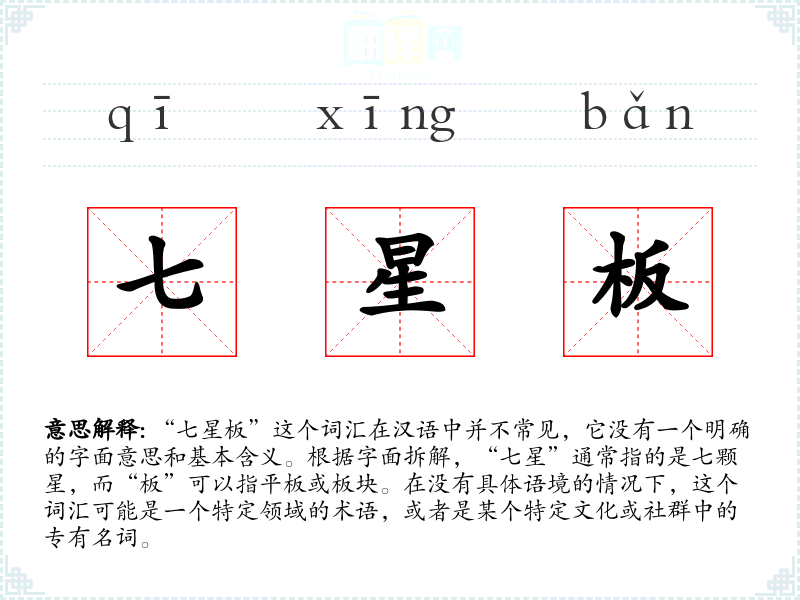 “七星板”这个词汇在没有具体语境的情况下,其意义和使用非常有限。如果有具体的上下文或领域,可以更好地理解和使用这个词汇。在语言学习和表达中,了解词汇的具体语境和背景是非常重要的。