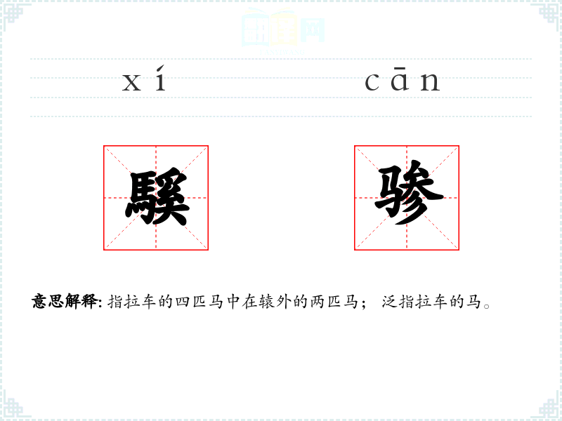 指拉车的四匹马中在辕外的两匹马; 泛指拉车的马。