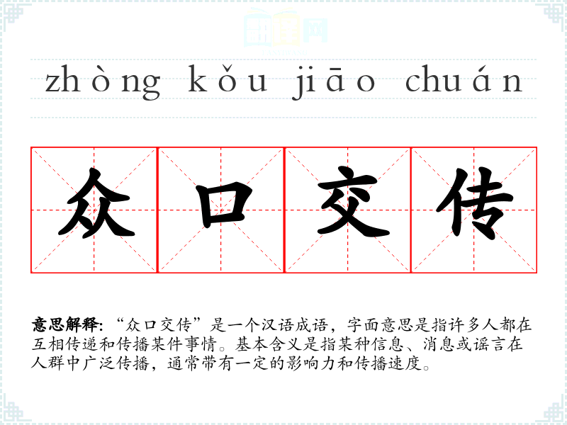“众口交传”是一个汉语成语,字面意思是指许多人都在互相传递和传播某件事情。基本含义是指某种信息、消息或谣言在人群中广泛传播,通常带有一定的影响力和传播速度。