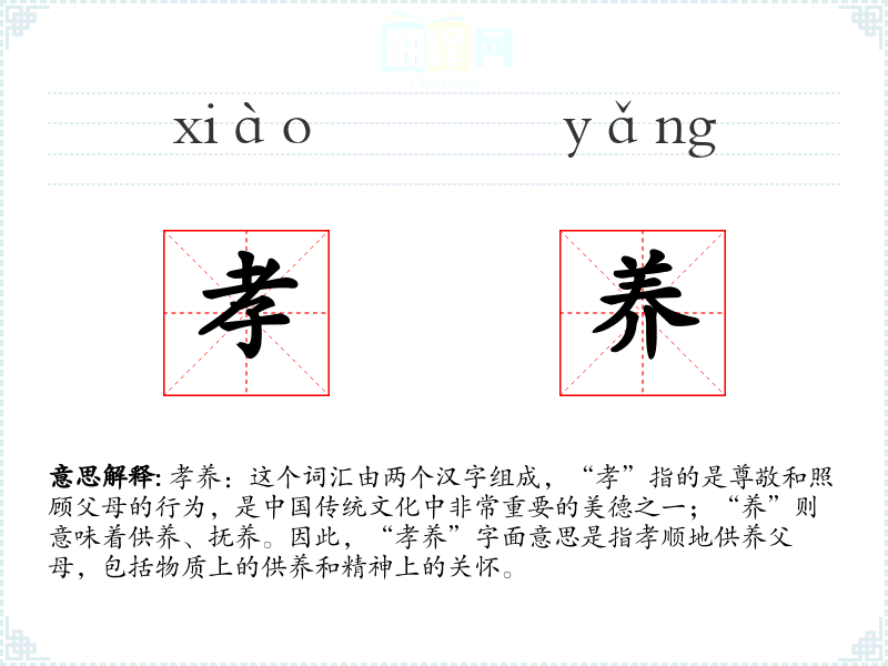 - 在现代社会,孝养的含义已经扩展到包括对老年人的全面关怀。