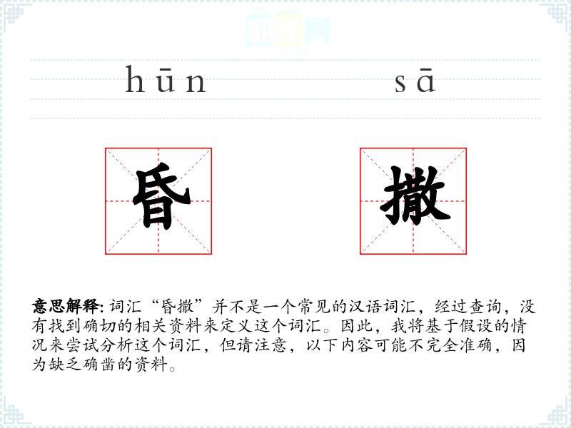 由于“昏撒”不是一个标准的汉语词汇,我们无法给出确切的字面意思和基本含义。如果这是一个方言词汇或者特定社群中的用语,它可能具有特定的含义,但这需要具体的语境来确定。