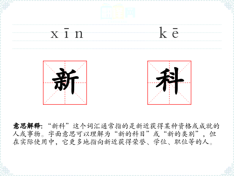 “新科”这个词汇通常指的是新近获得某种资格或成就的人或事物。字面意思可以理解为“新的科目”或“新的类别”,但在实际使用中,它更多地指向新近获得荣誉、学位、职位等的人。