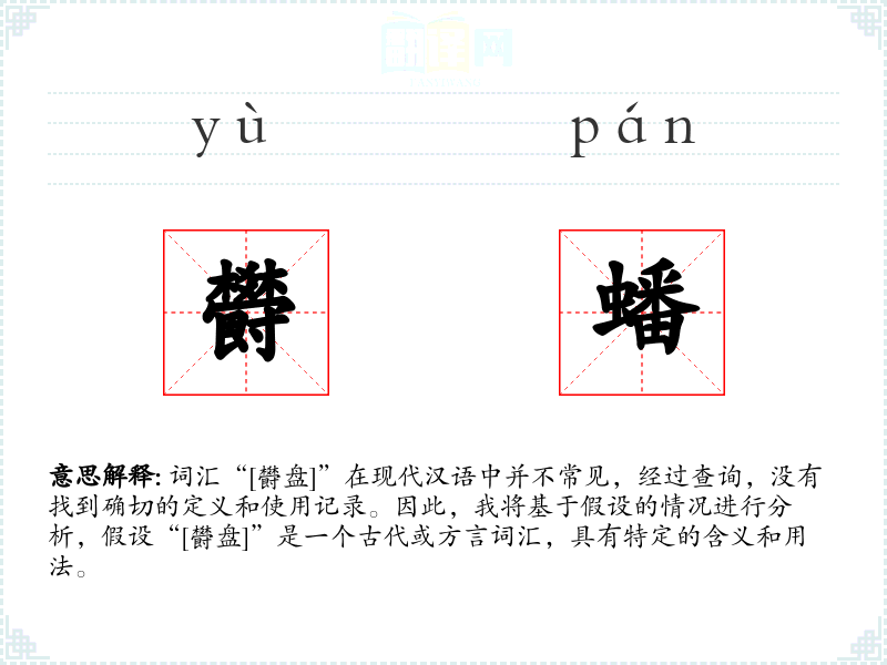 词汇“[欎盘]”在现代汉语中并不常见,经过查询,没有找到确切的定义和使用记录。因此,我将基于假设的情况进行分析,假设“[欎盘]”是一个古代或方言词汇,具有特定的含义和用法。