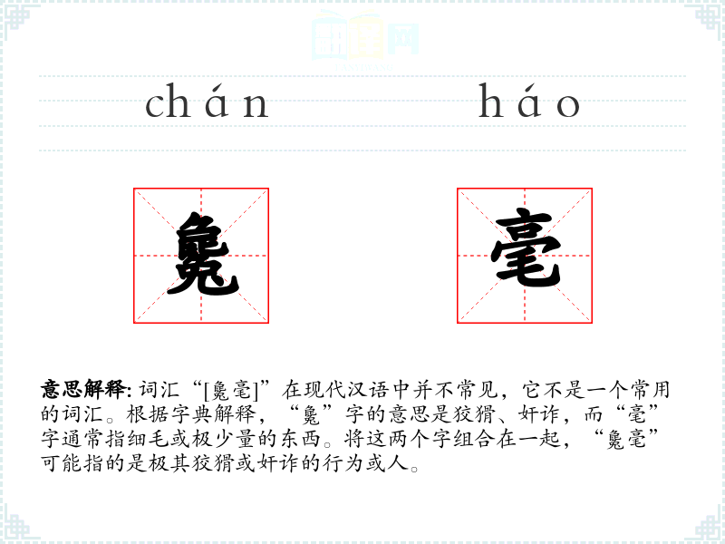 词汇“[毚毫]”在现代汉语中并不常见,它不是一个常用的词汇。根据字典解释,“毚”字的意思是狡猾、奸诈,而“毫”字通常指细毛或极少量的东西。将这两个字组合在一起,“毚毫”可能指的是极其狡猾或奸诈的行为或人。