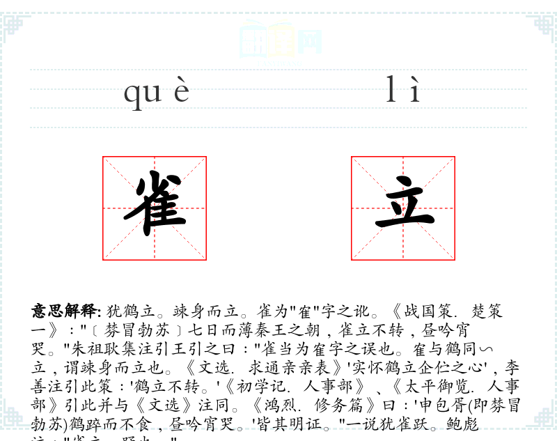 1.犹鹤立。竦身而立。雀为"隺"字之讹。《战国策.楚策一》﹕"﹝棼冒勃苏﹞七日而薄秦王之朝﹐雀立不转﹐昼吟宵哭。"朱祖耿集注引王引之曰﹕"雀当为隺字之误也。隺与鹤同∽立﹐谓竦身而立也。《文选.求通亲亲表》'实怀鹤立企伫之心'﹐李善注引此策﹕'鹤立不转。'《初学记.人事部》﹑《太平御览.人事部》引此并与《文选》注同。《鸿烈.修务篇》曰﹕'申包胥(即棼冒勃苏)鹤踤而不食﹐昼吟宵哭。'皆其明证。"一说犹雀跃。鲍彪注﹕"雀立﹐踊也。"