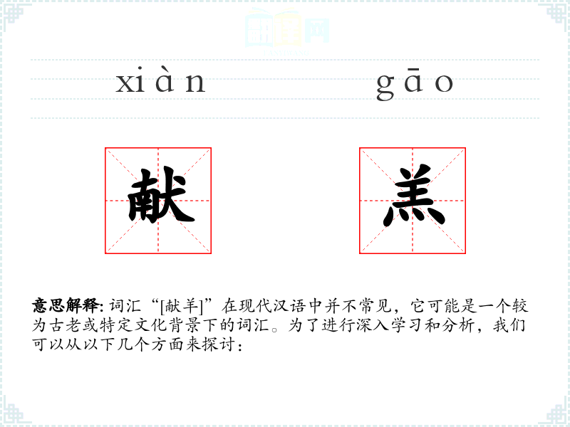 词汇“[献羊]”在现代汉语中并不常见,它可能是一个较为古老或特定文化背景下的词汇。为了进行深入学*和分析,我们可以从以下几个方面来探讨: