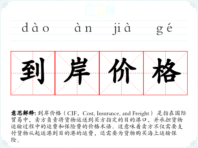 到岸价格(CIF,Cost, Insurance, and Freight) 是指在国际贸易中,卖方负责将货物运送到买方指定的目的港口,并承担货物运输过程中的运费和保险费的价格术语。这意味着卖方不仅需要支付货物从起运港到目的港的运费,还需要为货物购买海上运输保险。