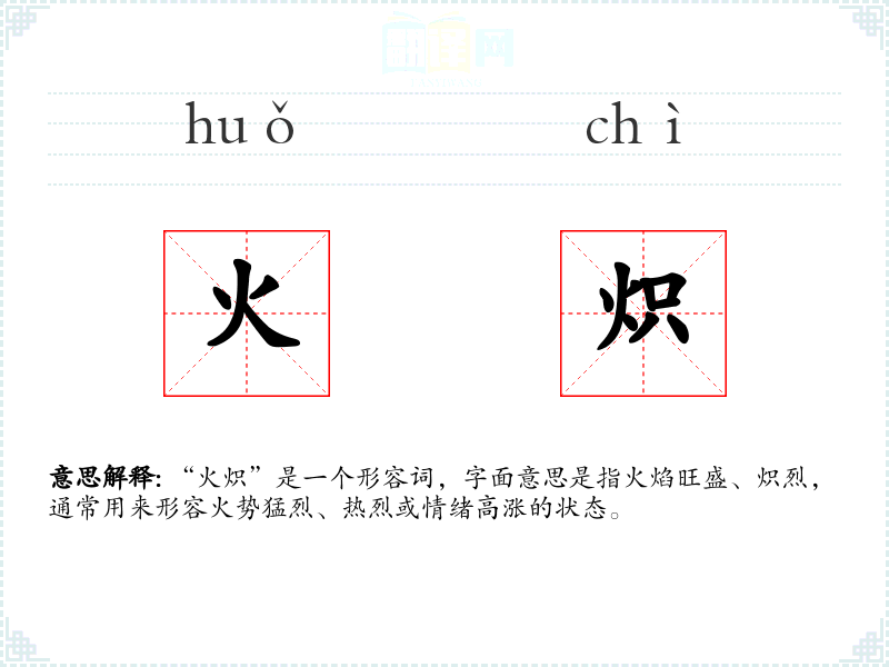 “火炽”是一个形容词,字面意思是指火焰旺盛、炽烈,通常用来形容火势猛烈、热烈或情绪高涨的状态。