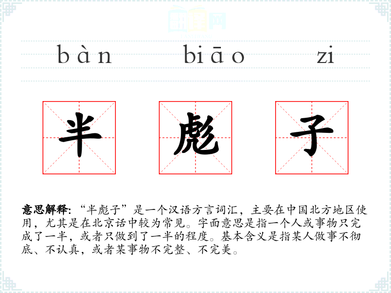“半彪子”是一个汉语方言词汇,主要在中国北方地区使用,尤其是在北京话中较为常见。字面意思是指一个人或事物只完成了一半,或者只做到了一半的程度。基本含义是指某人做事不彻底、不认真,或者某事物不完整、不完美。