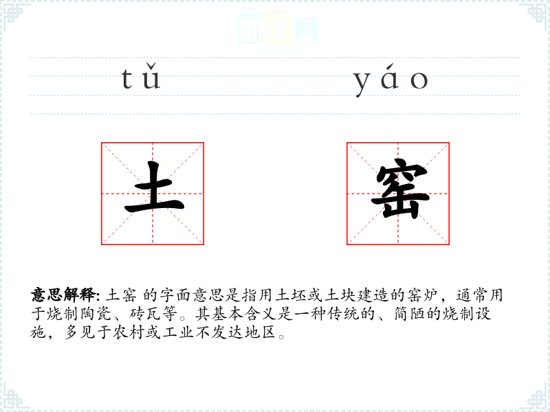 土窑 的字面意思是指用土坯或土块建造的窑炉,通常用于烧制陶瓷、砖瓦等。其基本含义是一种传统的、简陋的烧制设施,多见于农村或工业不发达地区。