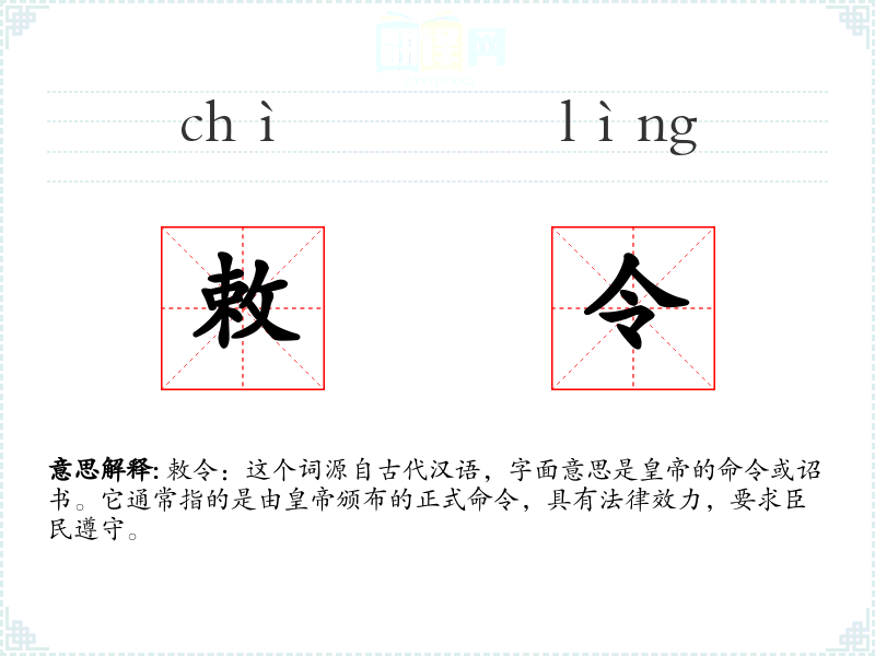 敕令:这个词源自古代汉语,字面意思是的命令或诏书。它通常指的是由颁布的正式命令,具有法律效力,要求臣民遵守。