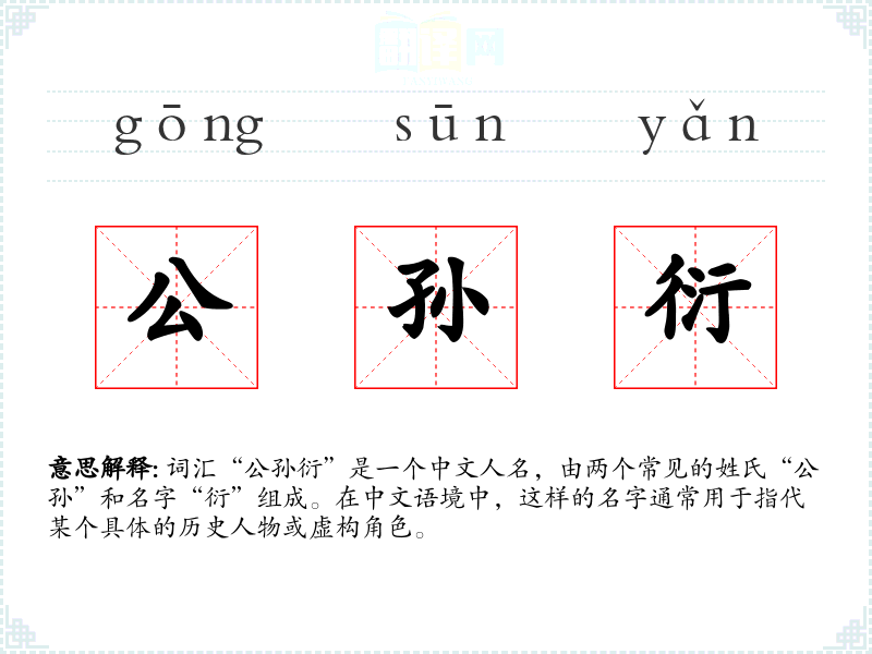 词汇“公孙衍”是一个中文人名,由两个常见的姓氏“公孙”和名字“衍”组成。在中文语境中,这样的名字通常用于指代某个具体的历史人物或虚构角色。