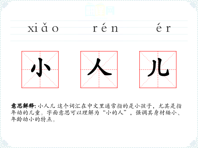 小人儿 这个词汇在中文里通常指的是小孩子,尤其是指年幼的儿童。字面意思可以理解为“小的人”,强调其身材矮小、年龄幼小的特点。