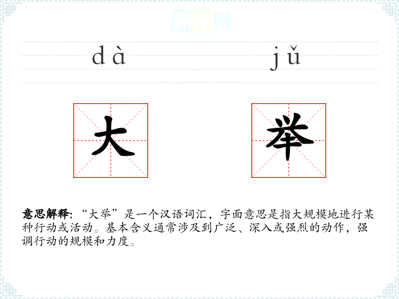“大举”一词的词源较为直接,由“大”和“举”两个字组成。在古代汉语中,“举”有行动、举行的意思,与“大”结合后,强调了行动的规模和力度。随着语言的发展,“大举”逐渐被广泛应用于各种语境中。