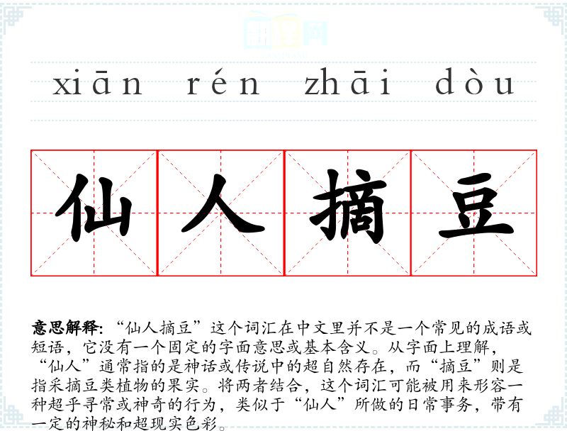 “仙人摘豆”这个词汇在中文里并不是一个常见的成语或短语,它没有一个固定的字面意思或基本含义。从字面上理解,“仙人”通常指的是神话或传说中的超自然存在,而“摘豆”则是指采摘豆类植物的果实。将两者结合,这个词汇可能被用来形容一种超乎寻常或神奇的行为,类似于“仙人”所做的日常事务,带有一定的神秘和超现实色彩。