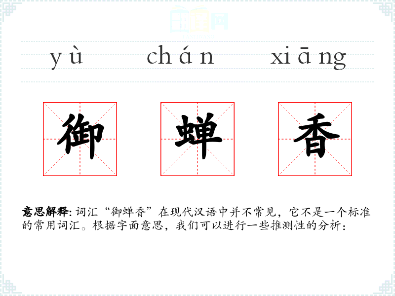 词汇“御蝉香”在现代汉语中并不常见,它不是一个标准的常用词汇。根据字面意思,我们可以进行一些推测性的分析: