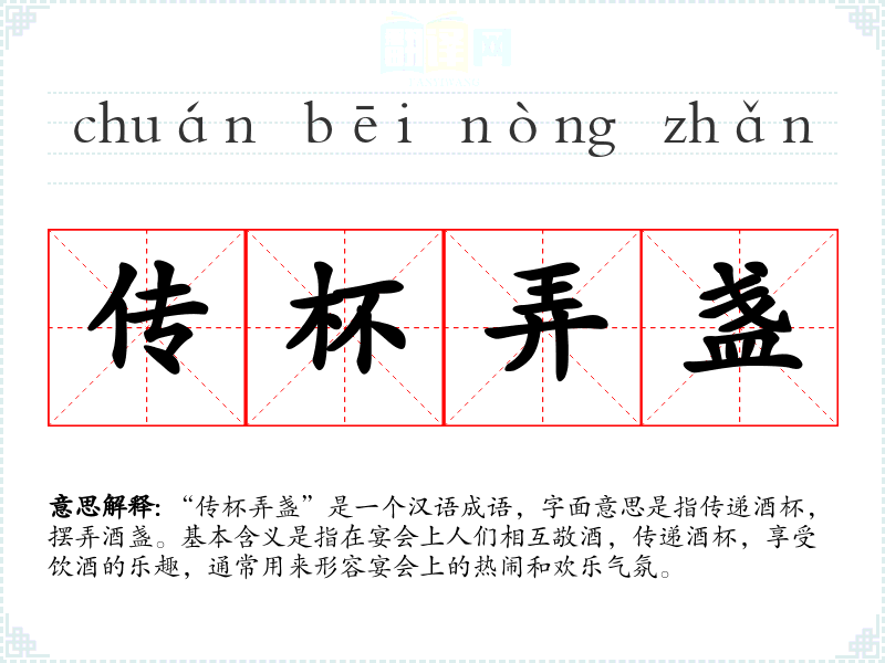 “传杯弄盏”是一个汉语成语,字面意思是指传递酒杯,摆弄酒盏。基本含义是指在宴会上人们相互敬酒,传递酒杯,享受饮酒的乐趣,通常用来形容宴会上的热闹和欢乐气氛。