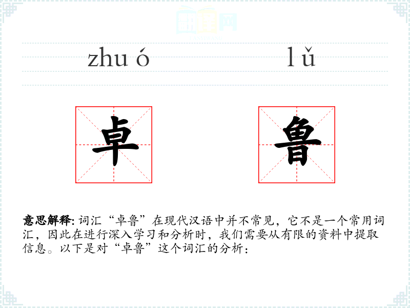 “卓鲁”的字面意思并不明确,因为它不是一个标准的汉语词汇。在古代文献中,“卓”通常指卓越、高超,而“鲁”则有朴实、粗鲁之意。将两者结合,可能意味着在朴实中显露出卓越的特质。