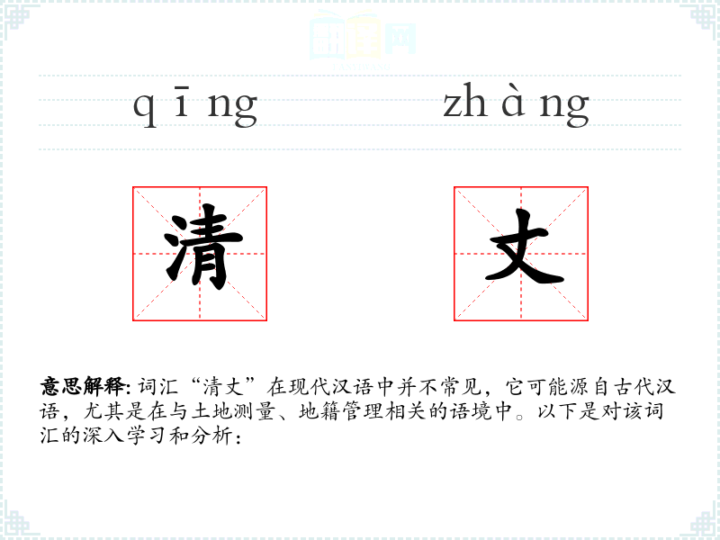 词汇“清丈”在现代汉语中并不常见,它可能源自古代汉语,尤其是在与土地测量、地籍管理相关的语境中。以下是对该词汇的深入学*和分析: