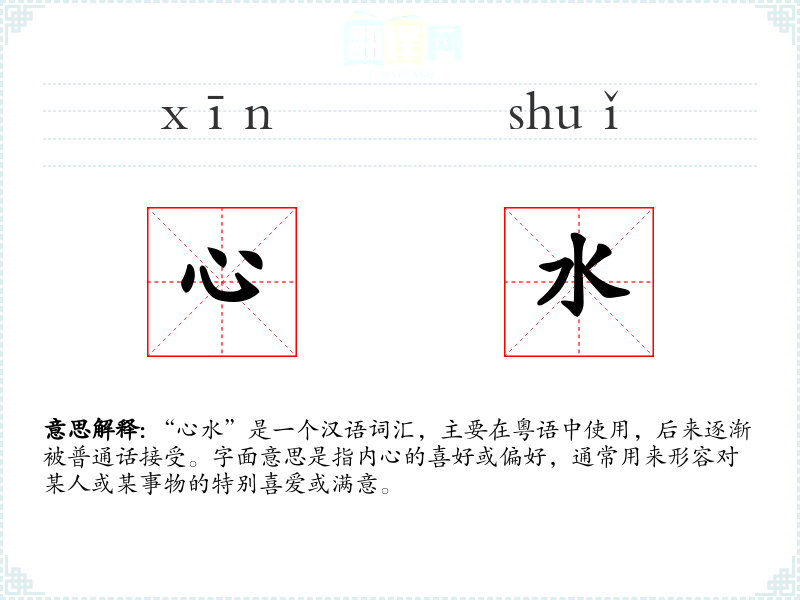 “心水”是一个汉语词汇,主要在粤语中使用,后来逐渐被普通话接受。字面意思是指内心的喜好或偏好,通常用来形容对某人或某事物的特别喜爱或满意。