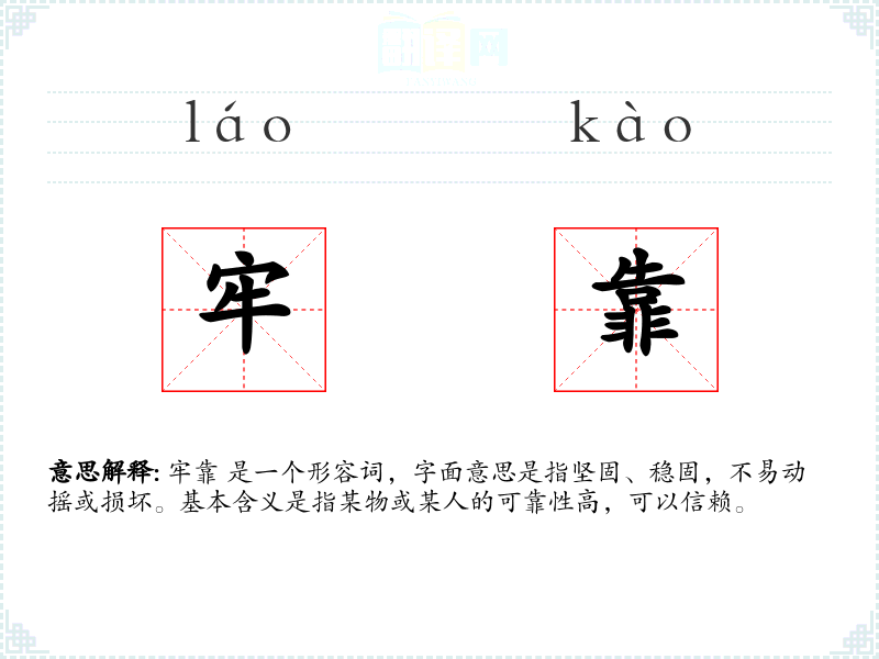 牢靠 是一个形容词,字面意思是指坚固、稳固,不易动摇或损坏。基本含义是指某物或某人的可靠性高,可以信赖。