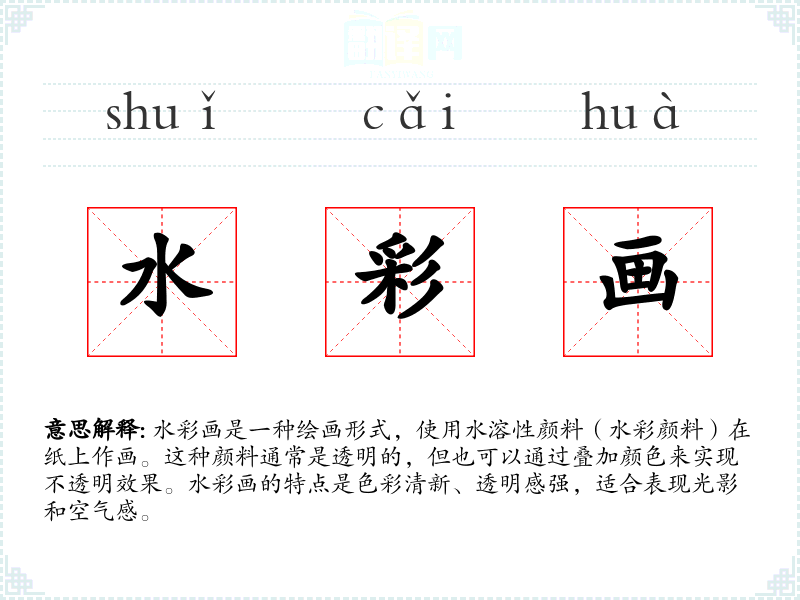 - 反义词:油画(与水彩画相比,油画颜料不透明,覆盖力强,色彩更厚重)
