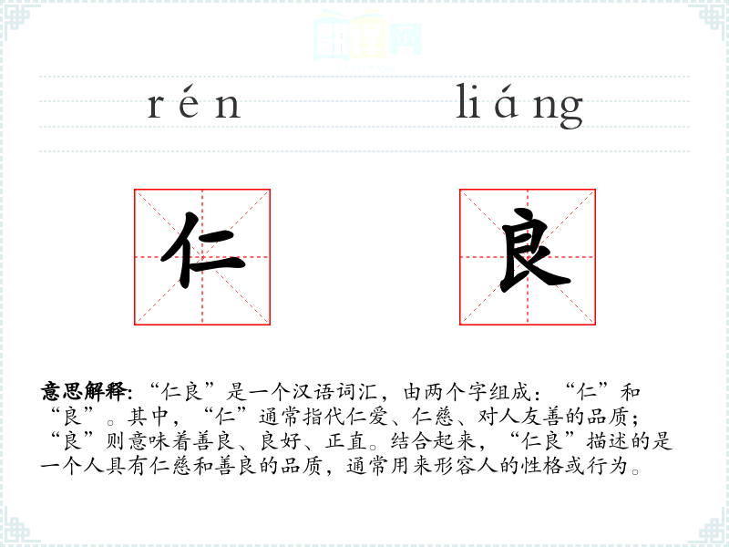 “仁良”是一个汉语词汇,由两个字组成:“仁”和“良”。其中,“仁”通常指代仁爱、仁慈、对人友善的品质;“良”则意味着善良、良好、正直。结合起来,“仁良”描述的是一个人具有仁慈和善良的品质,通常用来形容人的性格或行为。