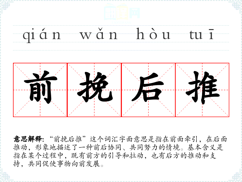 “前挽后推”这个词汇不仅形象生动,而且富含深意,它提醒我们在任何合作或集体行动中,都需要前后的协同和支持。在语言学*和表达中,理解和运用这样的词汇能够丰富我们的表达方式,增强沟通的效果。