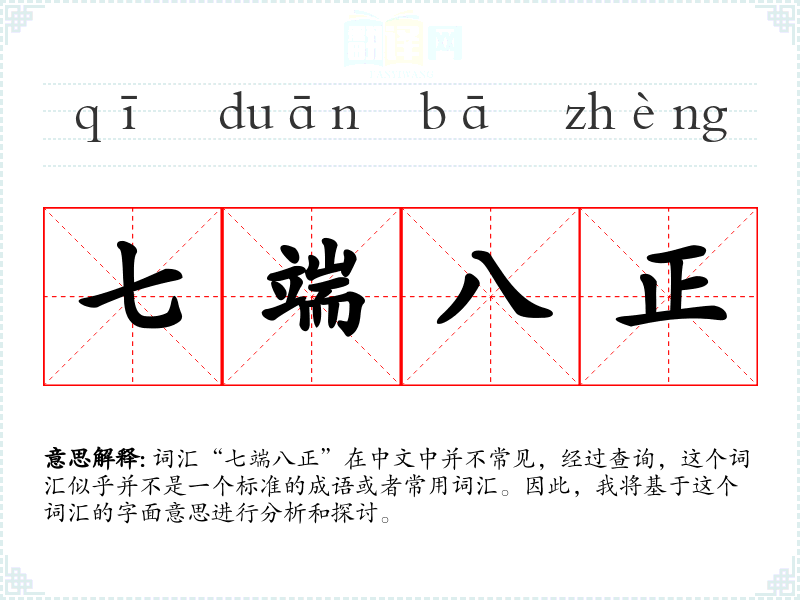 由于“七端八正”不是一个常见词汇,它在不同语言或文化中的对应词汇可能不存在。如果存在类似的表达,可能是在描述某种特定的文化或社群价值观。