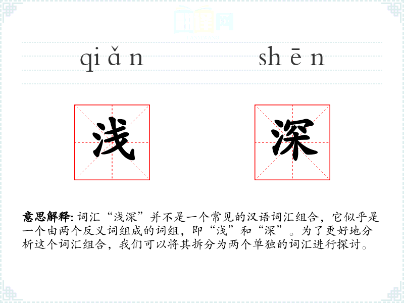 词汇“浅深”并不是一个常见的汉语词汇组合,它似乎是一个由两个反义词组成的词组,即“浅”和“深”。为了更好地分析这个词汇组合,我们可以将其拆分为两个单独的词汇进行探讨。