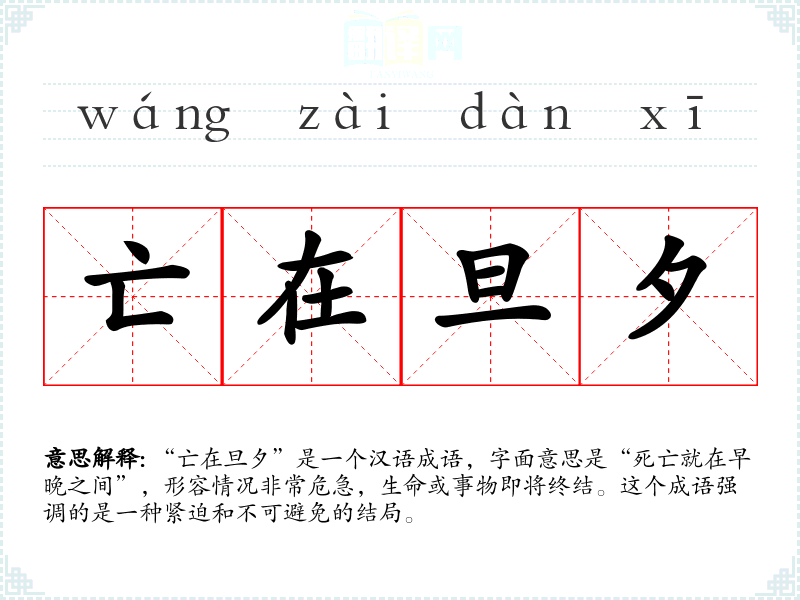“亡在旦夕”是一个汉语成语,字面意思是“死亡就在早晚之间”,形容情况非常危急,生命或事物即将终结。这个成语强调的是一种紧迫和不可避免的结局。