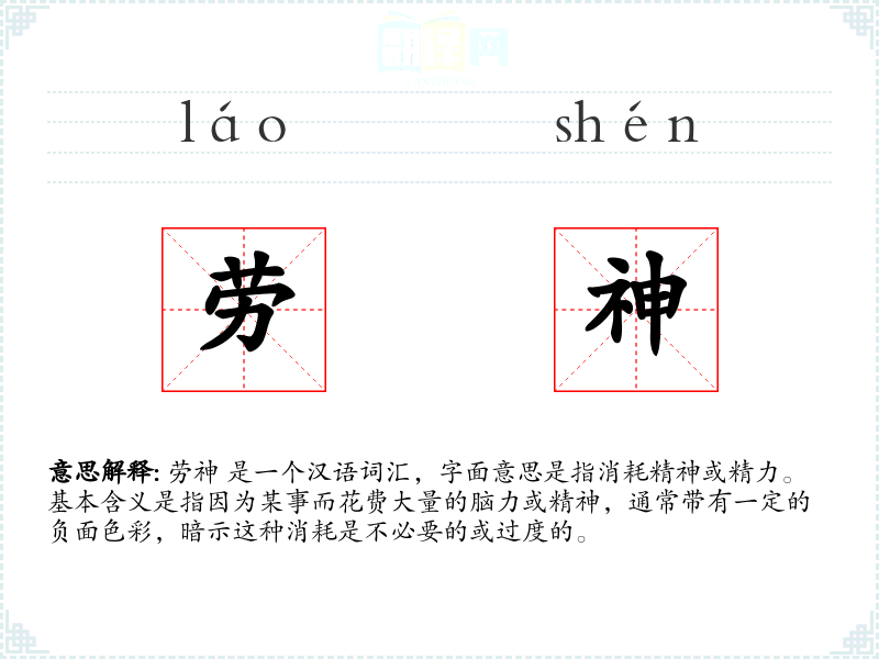 劳神 是一个汉语词汇,字面意思是指消耗精神或精力。基本含义是指因为某事而花费大量的脑力或精神,通常带有一定的负面色彩,暗示这种消耗是不必要的或过度的。