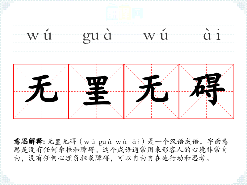 无罣无碍(wú guà wú ài)是一个汉语成语,字面意思是没有任何牵挂和障碍。这个成语通常用来形容人的心境非常自由,没有任何心理负担或障碍,可以自由自在地行动和思考。