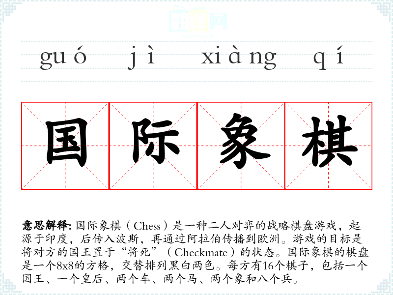 "国际象棋"的意思解释、国际象棋是什么意思由翻译网汉语词典查词提供。