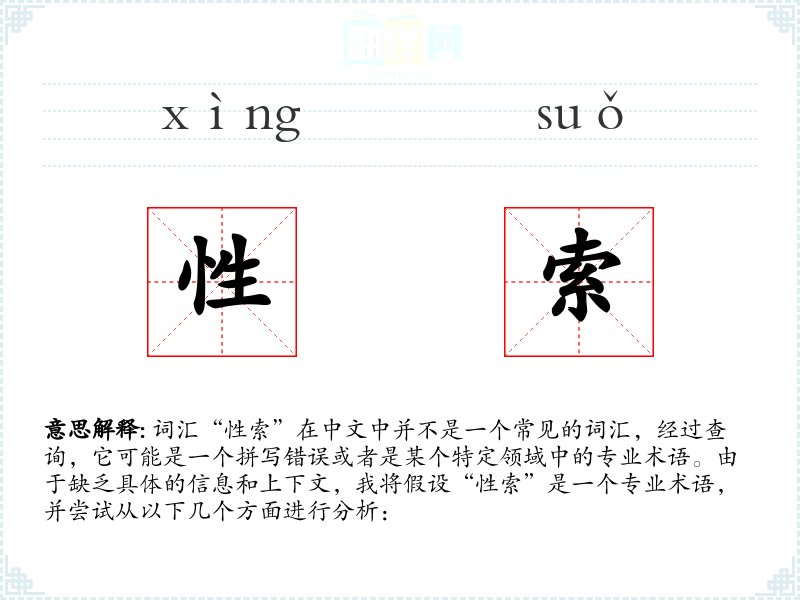词汇“性索”在中文中并不是一个常见的词汇,经过查询,它可能是一个拼写错误或者是某个特定领域中的专业术语。由于缺乏具体的信息和上下文,我将假设“性索”是一个专业术语,并尝试从以下几个方面进行分析: