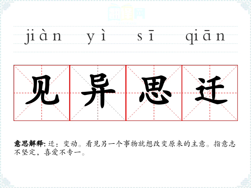 迁:变动。看见另一个事物就想改变原来的主意。指意志不坚定,喜爱不专一。