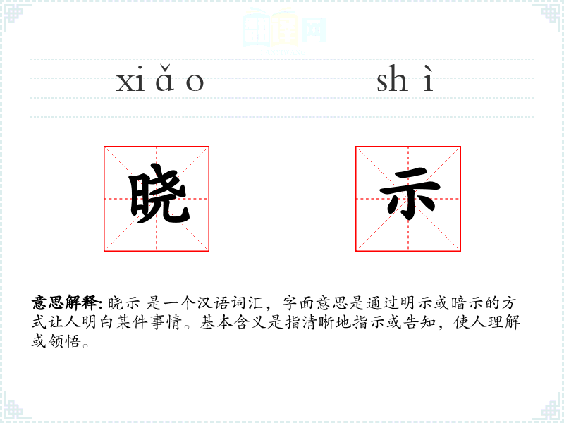 晓示 是一个汉语词汇,字面意思是通过明示或暗示的方式让人明白某件事情。基本含义是指清晰地指示或告知,使人理解或领悟。