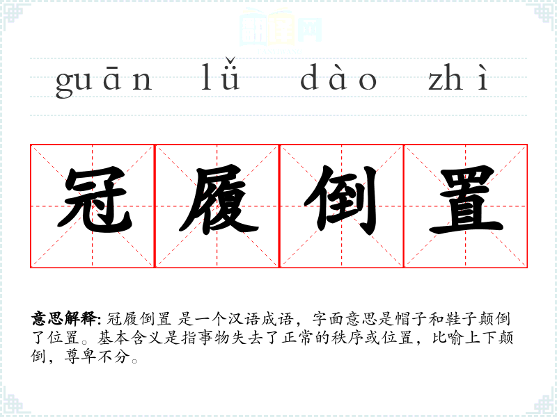 冠履倒置 是一个汉语成语,字面意思是帽子和鞋子颠倒了位置。基本含义是指事物失去了正常的秩序或位置,比喻上下颠倒,尊卑不分。