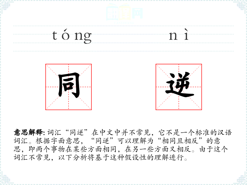 “同逆”字面意思是指在某些方面相同,在另一些方面相反。这个词汇可能用于描述两个或多个事物的复杂关系,它们既有共同点也有对立点。