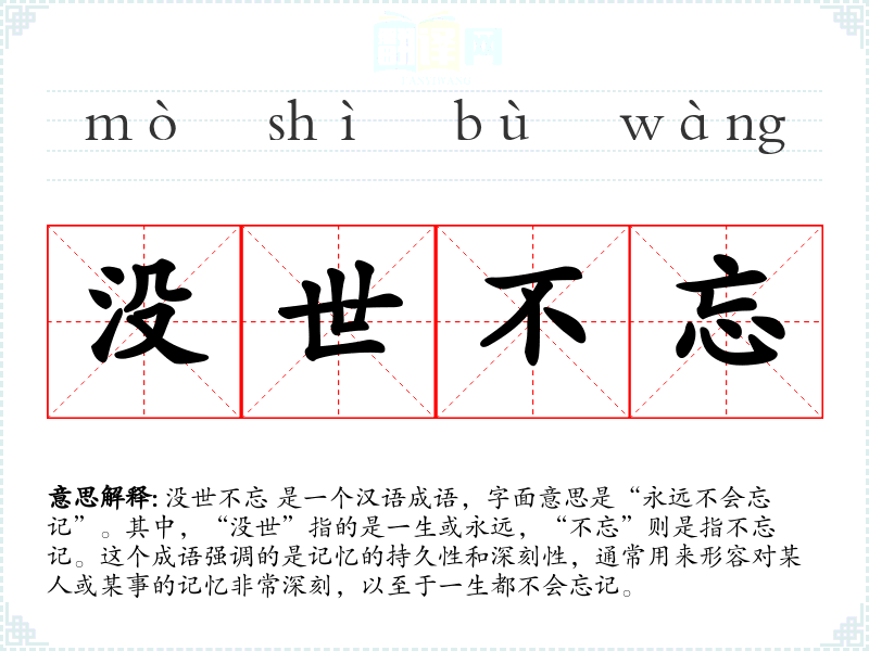 没世不忘 是一个汉语成语,字面意思是“永远不会忘记”。其中,“没世”指的是一生或永远,“不忘”则是指不忘记。这个成语强调的是记忆的持久性和深刻性,通常用来形容对某人或某事的记忆非常深刻,以至于一生都不会忘记。