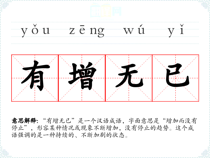 “有增无已”是一个汉语成语,字面意思是“增加而没有停止”,形容某种情况或现象不断增加,没有停止的趋势。这个成语强调的是一种持续的、不断加剧的状态。