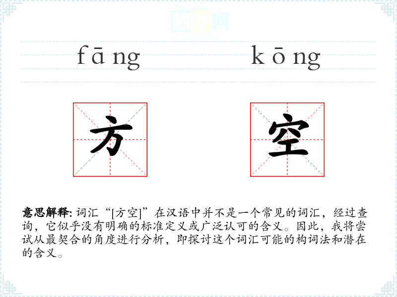 词汇“[方空]”在汉语中并不是一个常见的词汇,经过查询,它似乎没有明确的标准定义或广泛认可的含义。因此,我将尝试从最契合的角度进行分析,即探讨这个词汇可能的构词法和潜在的含义。