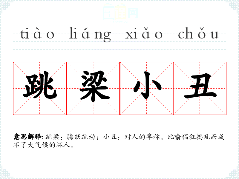 跳梁:腾跃跳动;小丑:对人的卑称。比喻猖狂捣乱而成不了大气候的坏人。